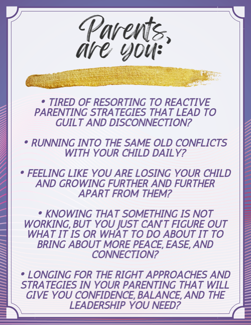 This program is for parents who are aware that they need to be the change in order to improve their parenting challenges, and are ready to go deep to get the family life they’ve been dreaming of, who are willing to change their perspective, invest in their family, and are willing to be guided by a professional.